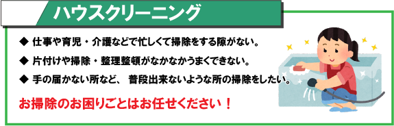 - 仕事が忙しくなかなか掃除が出来ないので、部屋の掃除と片付けを頼みたい。