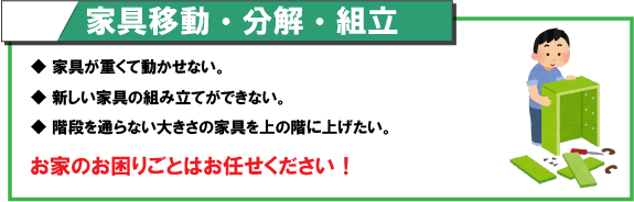 - 子供が一人暮らしを始めるので、家具の移動や照明の取り付けを手伝ってほしい。